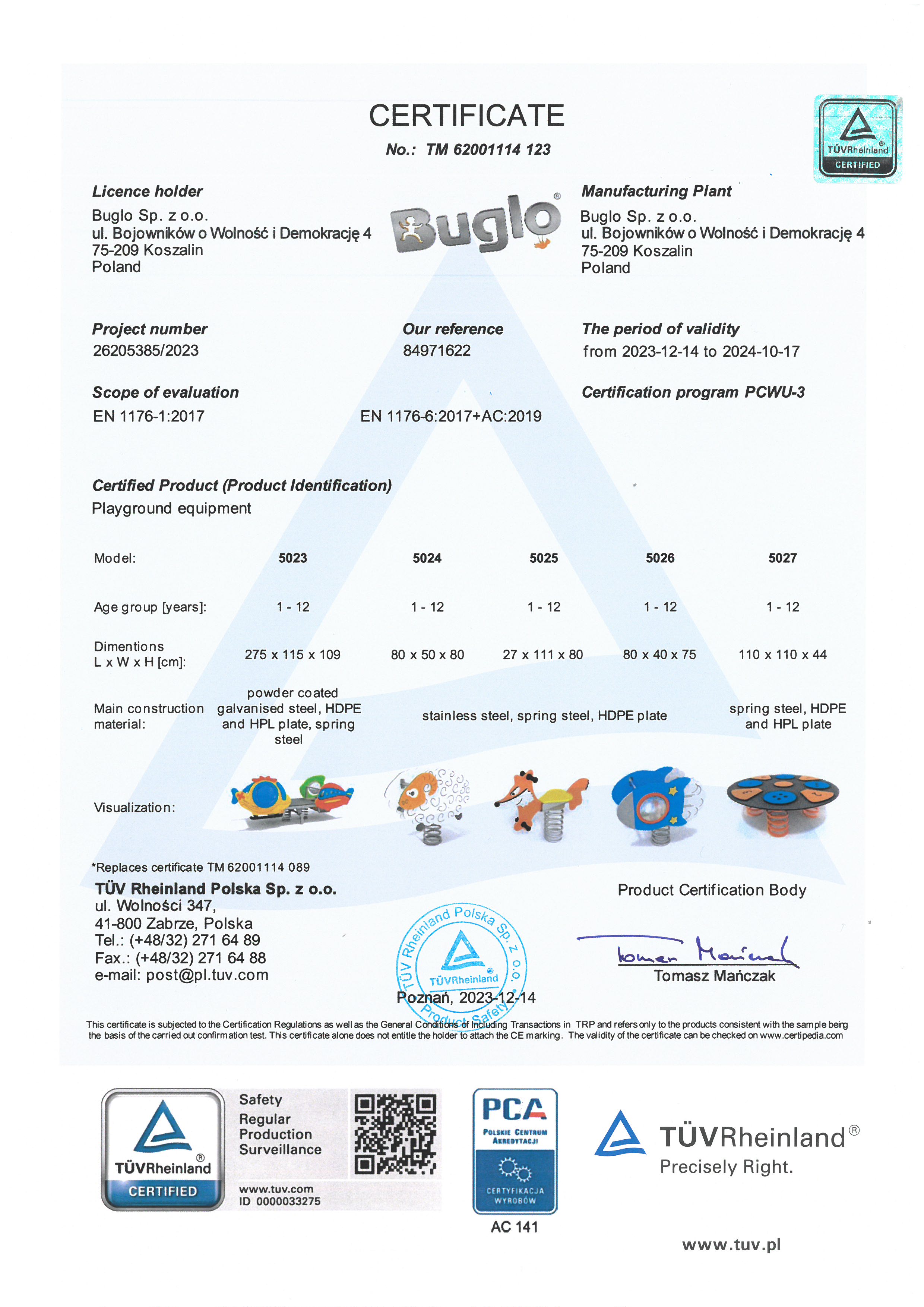 Toate echipamentele de recreere și de joacă trebuie să dețină certificate de conformitate cu seria de standarde EN 1176 – Echipamente și suprafețe pentru spații de joacă, (în cazul echipamentelor de fitness și street workout, standardul este EN 16630:2015).