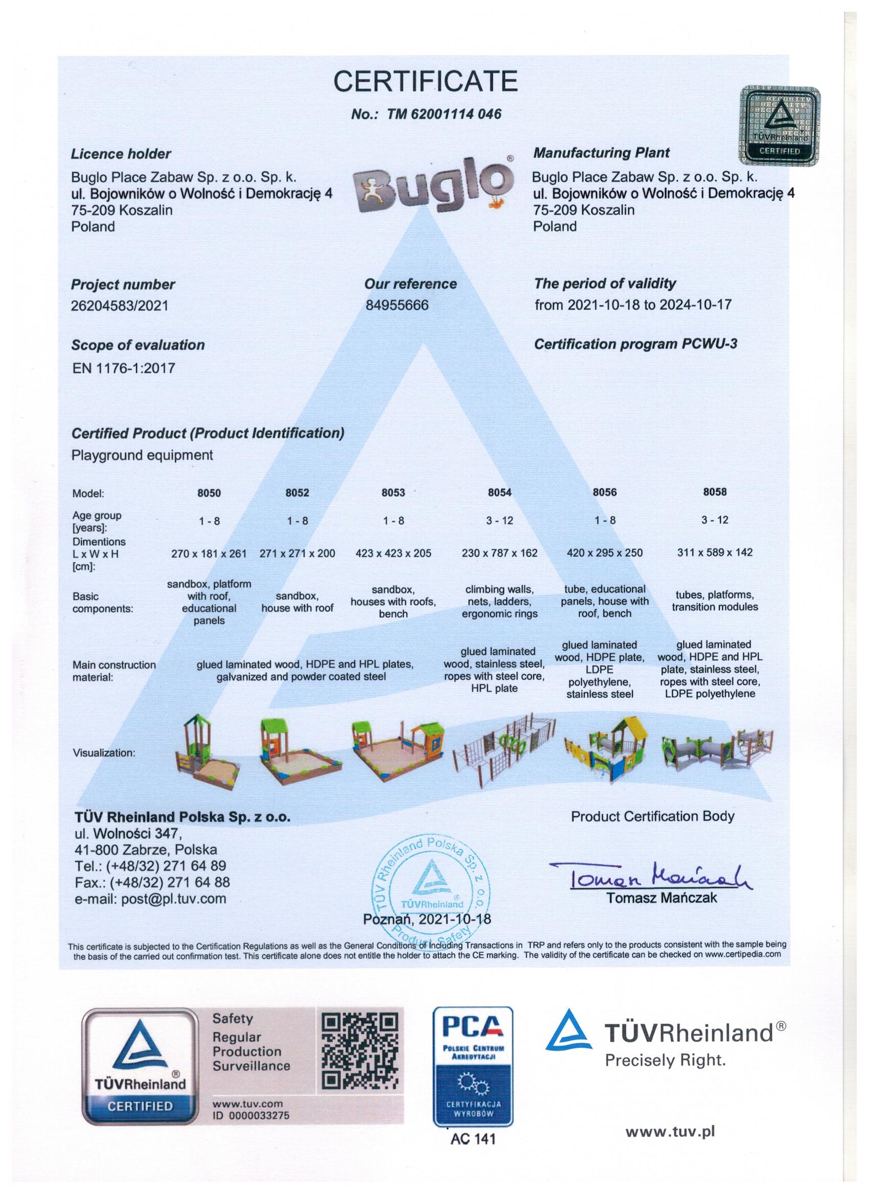 Toate echipamentele de recreere și de joacă trebuie să dețină certificate de conformitate cu seria de standarde EN 1176 – Echipamente și suprafețe pentru spații de joacă, (în cazul echipamentelor de fitness și street workout, standardul este EN 16630:2015).
