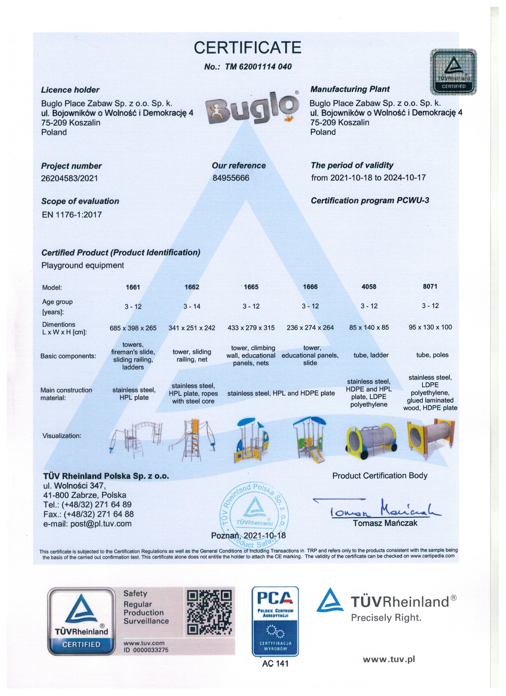 Toate echipamentele de recreere și de joacă trebuie să dețină certificate de conformitate cu seria de standarde EN 1176 – Echipamente și suprafețe pentru spații de joacă, (în cazul echipamentelor de fitness și street workout, standardul este EN 16630:2015).