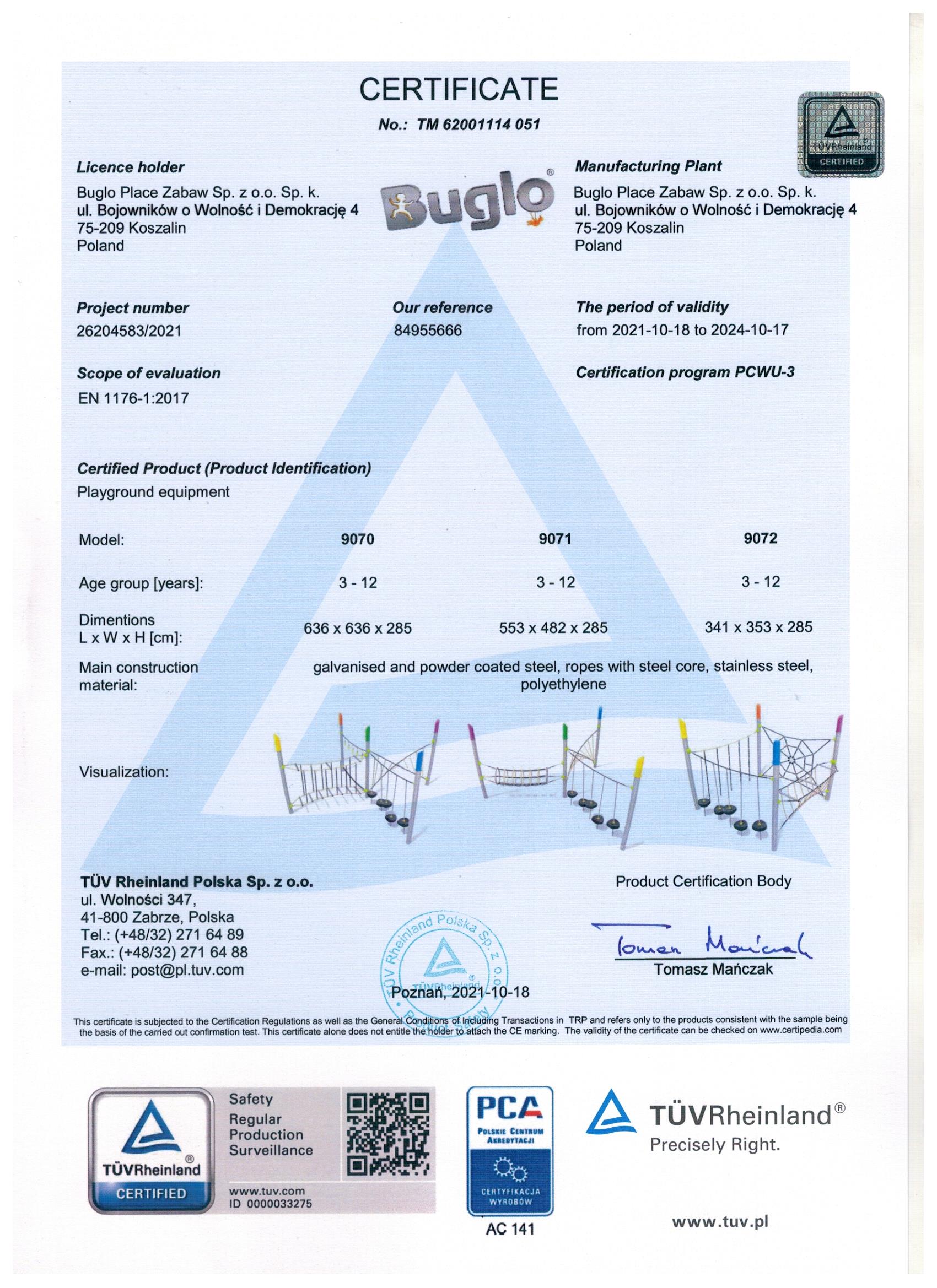 Toate echipamentele de recreere și de joacă trebuie să dețină certificate de conformitate cu seria de standarde EN 1176 – Echipamente și suprafețe pentru spații de joacă, (în cazul echipamentelor de fitness și street workout, standardul este EN 16630:2015).
