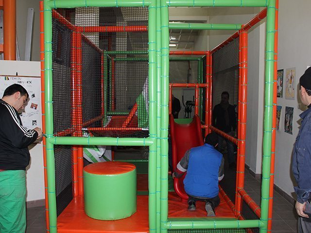 Cilindru de căţărare, tobogan mediu, obstacole oblice intercalate, obstacole semicilindrice orizontale, obstacol suspendat tip sac de box, piscină cu bile. |