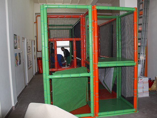 | Materiale: | Structura este din oţel galvanizat şi este învelită integral cu un strat de burete care amortizează şocurile. Platformele sunt confecţionate din placaj multistrat, acoperit cu burete şi folie PVC. Bilele folosite în piscinele acestor echipamente sunt realizate din PVC şi au diametrul de 7cm. Întreaga structură de joacă modulară este delimitată cu plase care elimină riscul căderii copiilor de la înălţime, obligă la respectarea anumitor trasee şi limitează accesul copiilor dinspre exteriorul locului de joacă în interior şi invers. |